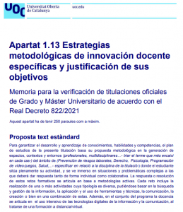 Tant si esteu verificant, reverificant o modificant una titulació i voleu saber com redactar l’apartat 1.13 “Estrategias metodológicas de innovación docente específicas y justificación de sus objetivos”, aquests textos us poden orientar. Són textos incorporats a Memòries de Titulació de la UOC que han estat resoltes favorablement.