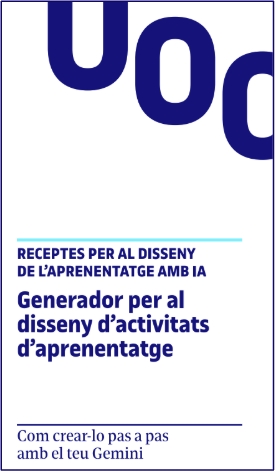 Aquest generador està dissenyat per ajudar-te a crear activitats d’aprenentatge per a les teves assignatures, a partir de la informació que li facilitis: el pla docent, els resultats d’aprenentatge, les hores de dedicació i les característiques de l’activitat.