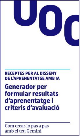 Aquest generador està dissenyat per acompanyar-te en la formulació i la revisió de resultats d’aprenentatge (RA) de les activitats d’avaluació contínua i criteris d’avaluació associats, de manera que n’agilitza el procés de redacció i revisió.