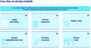 A través d’una infografia dinàmica s’explica l’estructura que ha de tenir la citació d’una referència bibliogràfica, incloent-hi la perspectiva de gènere, segons les diferents tipologies de fonts d’informació. A més, s’inclou els diferents estils de citació: ISO 690, APA i Vancouver.