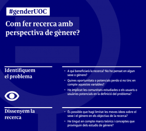 Infografia que revisa els ítems a considerar alhora de fer recerca amb perspectiva de gènere: identificar el problema, dissenyar la recerca, pensar la metodologia i les dades, revisar l’equip de recerca, comprovar críticament les dades i els resultats, analitzar la disseminació i la comunicació, aspectes de transferència i innovació.