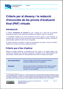 La virtualització de les proves d’avaluació final (PAF) suposa oferir un tipus de proves que permetin avaluar l’aprenentatge de l’estudiant, mantenint la proporcionalitat i garantint al màxim el rigor i la seguretat. En aquest document es proposen un seguit de recomanacions per aplicar a l’hora de concebre i redactar els enunciats de les proves d’avaluació final.