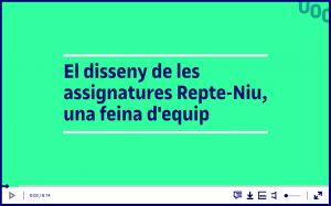 Aquest recurs audiovisual presenta l’experiència de l’assessorament al voltant del disseny de les assignatures Repte-Niu. En aquest procés participen el professorat responsable de l’assignatura, acompanyat i guiat per l’equip d’Assessorament per al Disseny de l’Aprenentatge, que l’assessora en els aspectes metodològics i pedagògics, així com també compta amb l’acompanyament de l’equip de Biblioteca per a l’Aprenentatge, que l’ajuda en tot el referent als Recursos d’Aprenentatge de l’assignatura.