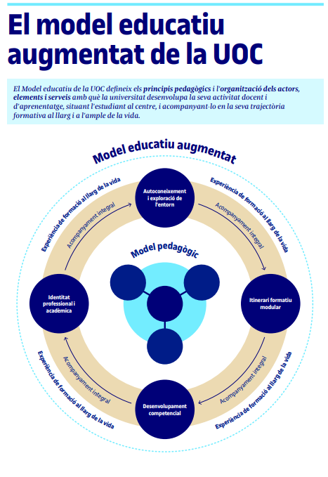 Aquesta infografia presenta el model educatiu augmentat de la UOC on es defineixen els principis pedagògics i l’organització dels actors, elements i serveis amb què la universitat desenvolupa la seva activitat docent i d’aprenentatge.