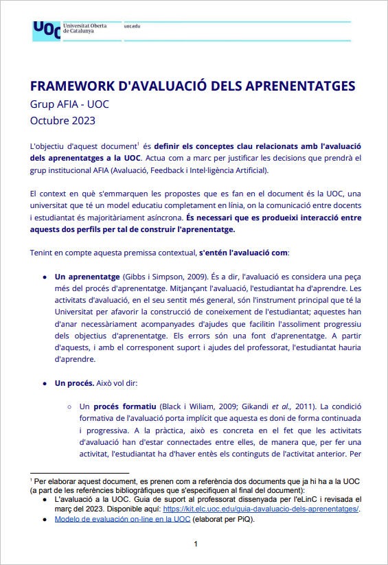 L’objectiu d’aquest document és definir els conceptes clau relacionats amb l’avaluació dels aprenentatges a la UOC. El context en què s’emmarquen les propostes que es fan en el document és la UOC, una universitat que té un model educatiu completament en línia. L’eix central del document es basa en conceptualitzar l’avaluació dels aprenentatges com a un aprenentatge i com a un procés formatiu, planificat i reflexiu.
