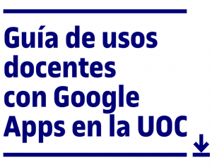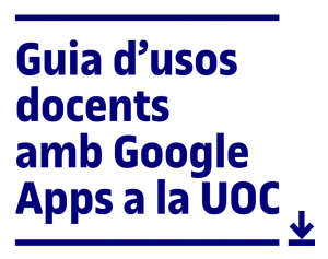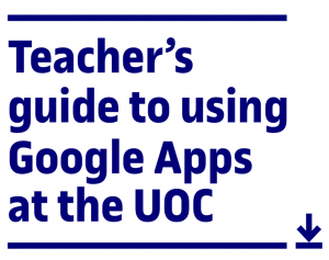 La Guia d’usos docents amb Google Apps a la UOC presenta sis conjunts d’usos d’aplicacions de Google, formulats des d’una perspectiva docent, per a ser aplicats d’acord amb el model d’ensenyament en línia de la UOC. Amb aquest plantejament, conté indicacions sobre com aplicar-los, recomanacions que cal tenir en compte o idees sobre possibles metodologies o activitats que podem implantar.