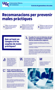 Aquesta infografia presenta orientacions per fomentar un ús adequat de les IA generatives per part de l’estudiantat. Apel·lar a l’ètica de l’estudiant, recordar la normativa acadèmica o bé parlar amb l’estudiant per validar l’autoria d’un prova, són algunes de les possibles accions recomanades.