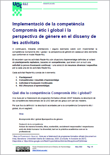 A continuació, trobaràs orientacions i alguns exemples sobre com implementar la competència Compromís Ètic i Global i la perspectiva de gènere en cadascun dels elements que conformen el model de disseny Repte-Niu.