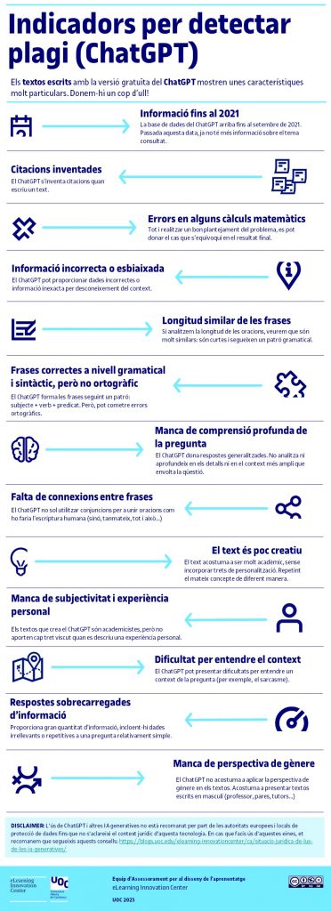 Per tal de poder reconèixer com funciona l’escriptura i els textos creats per la versió gratuïta del ChatGPT, s’ha creat una guia amb un conjunt d’indicadors que ajudaran a sospitar de la presència d’aquest tipus de plagi.