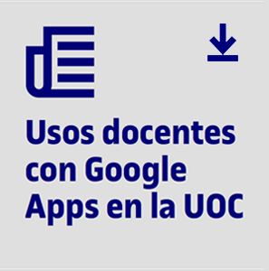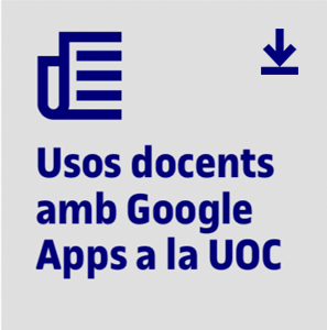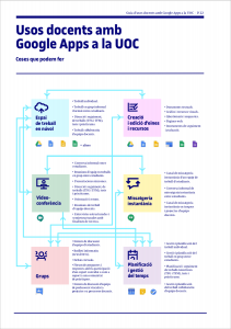 La infografia Usos docents amb Google Apps a la UOC ens ofereix un recull de les coses que podem fer dins dels sis usos docents exposats a la guia: espai de treball al núvol, creació i edició d’eines i recursos, videoconferència, missatgeria instantània, grups i planificació i gestió del temps.