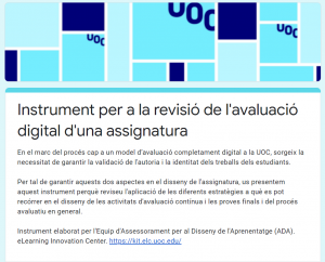 Amb l’objectiu de garantir la identitat i autoria de les proves d’avaluació contínua i/o avaluació final proposades en la vostra assignatura, us presentem el següent instrument perquè reviseu l’aplicació de les diferents estratègies a què es pot recórrer en el disseny de les activitats d’avaluació contínua i les proves finals.