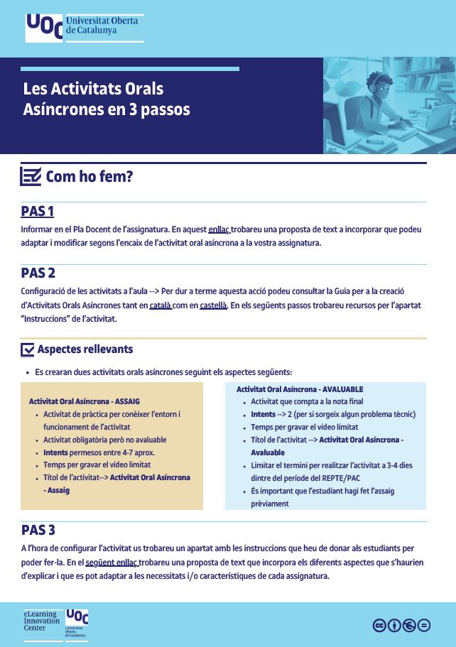 Aquesta infografia proporciona, en tres passos senzills, les directrius i els recursos necessaris a tenir en compte en la realització de les Activitats Orals Asíncrones.