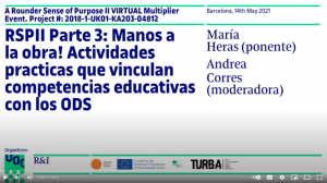 Dins del marc RSP II: A Rounder Sense of Purpose II, el vídeo mostra la presentació de l’apartat Manos a la obra! Actividades prácticas que vinculan competencias educativas con los ODS, a càrrec de la Doctora per la UAB en Ciència i Tecnologia ambiental, María Heras.