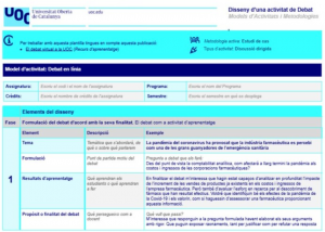 Dur a terme una activitat de debat en línia requereix d’una planificació que va més enllà de triar el tema a debatre. Aquest exemple us ajudarà a pensar en tots els elements del disseny formatiu propis d’un debat en línia per a no deixar-vos res! Disposeu també d’una plantilla que us podeu descarregar per treballar en el vostre disseny.