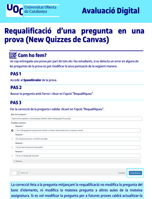 Requalificació d’una pregunta en una prova Partner docent per al disseny de l'aprenentatge14 de gener de 202614 de gener de 2026 Consulta els passos que cal seguir per canviar la puntuació d’una pregunta en una prova de Canvas amb l’eina de New Quizzes. Temps de consulta: 10′ Accedeix al recurs: [català] [castellà] Recursos relacionatsCreació i anàlisi dels informes de les proves Proves Orals Virtuals Síncrones (POVS) – Disseny Les Activitats Orals Asíncrones en 3 passos