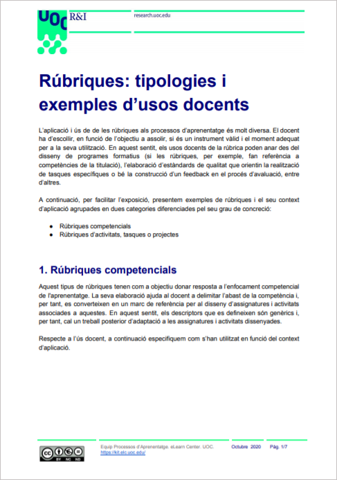 L’aplicació i ús de de les rúbriques als processos d’aprenentatge és molt diversa. A continuació, presentem alguns exemples de rúbriques i el seu context d’aplicació, agrupades en dues categories diferenciades pel seu grau de concreció: