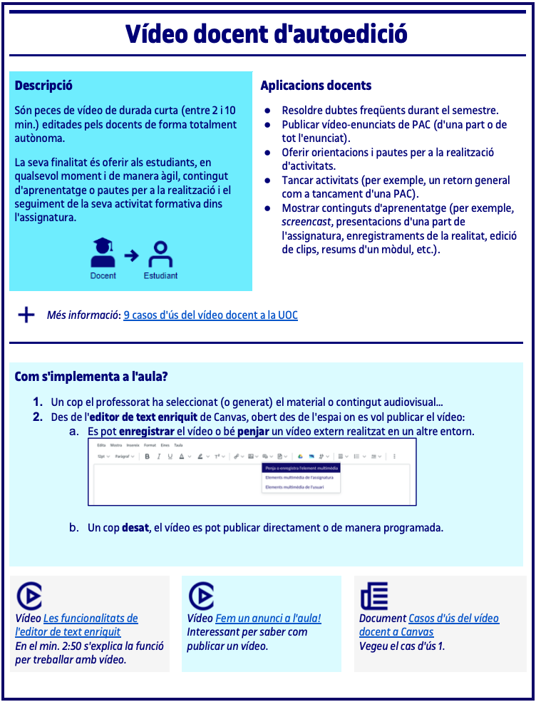El vídeo és una eina poderosa per enriquir l’experiència d’aprenentatge a l’aula, ja sigui per explicar conceptes complexos, il·lustrar processos, fomentar el pensament crític o dinamitzar les classes. La seva versatilitat permet utilitzar-lo en diferents moments de la docència. En aquest recurs trobaràs orientacions pràctiques per integrar el vídeo de manera efectiva a la teva docència, ofereix un ventall d’aplicacions i un pas a pas per implementar-lo a l’aula.
