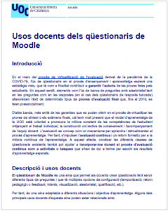 Recurs que presenta els diferents usos docents dels qüestionaris de Moodle en relació al model de l’avaluació de la UOC i les consideracions que cal tenir en compte per introduir-los en l’avaluació contínua i l’avaluació final.